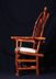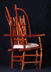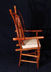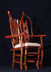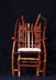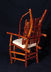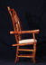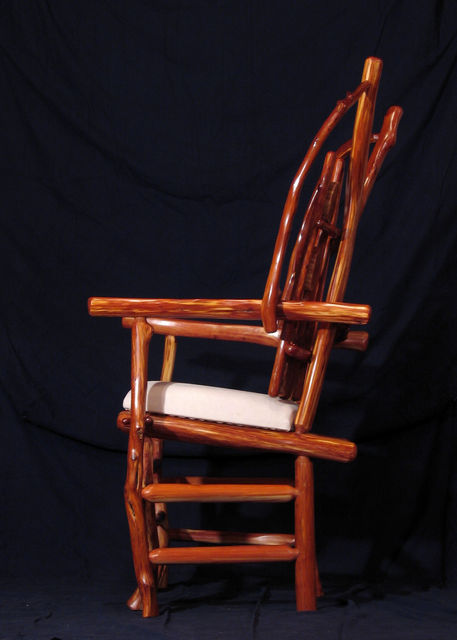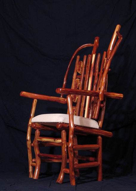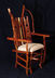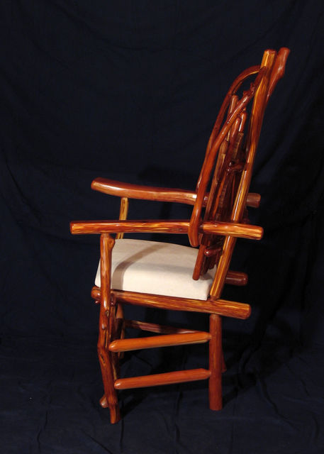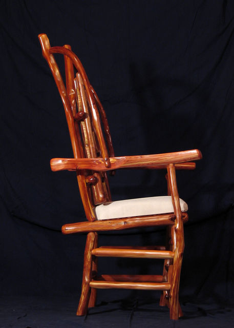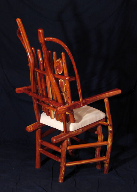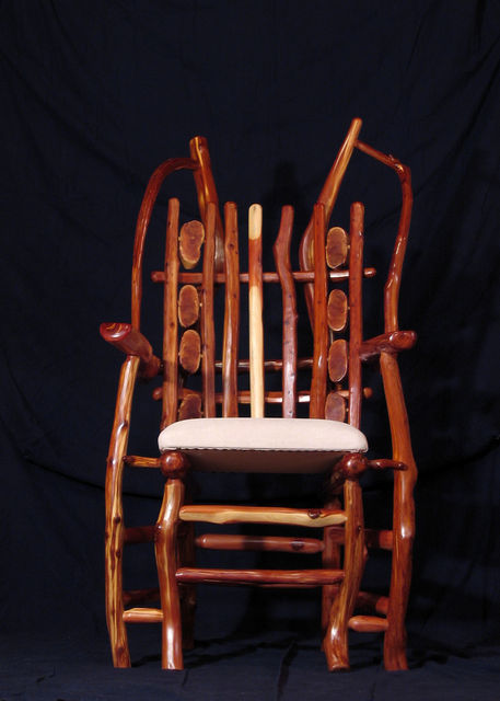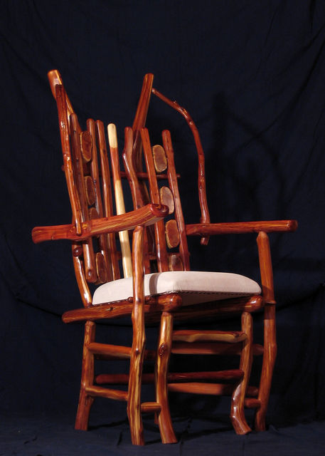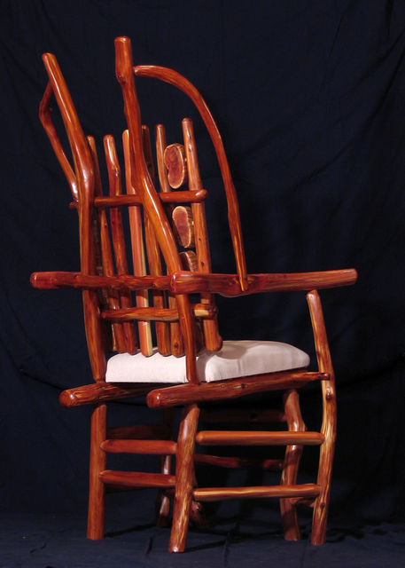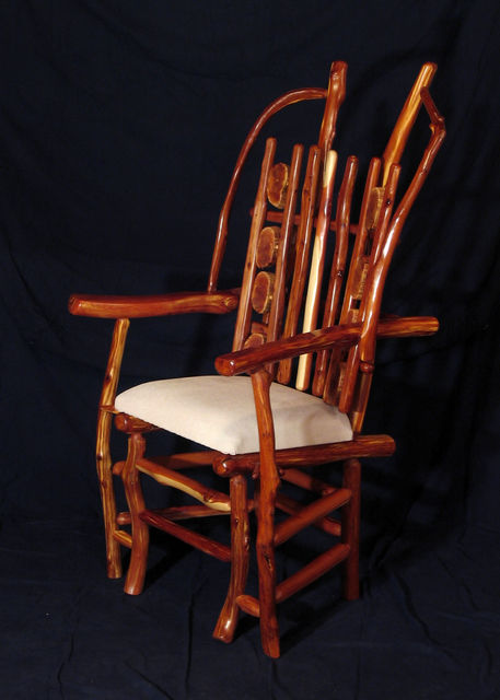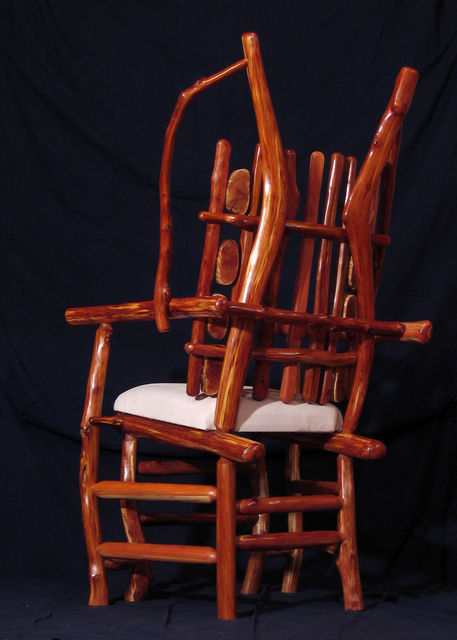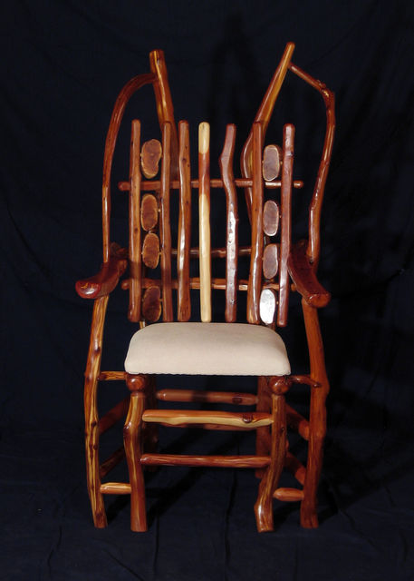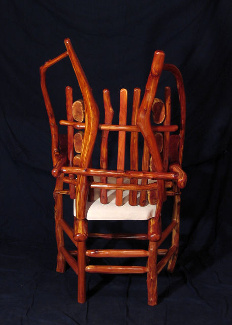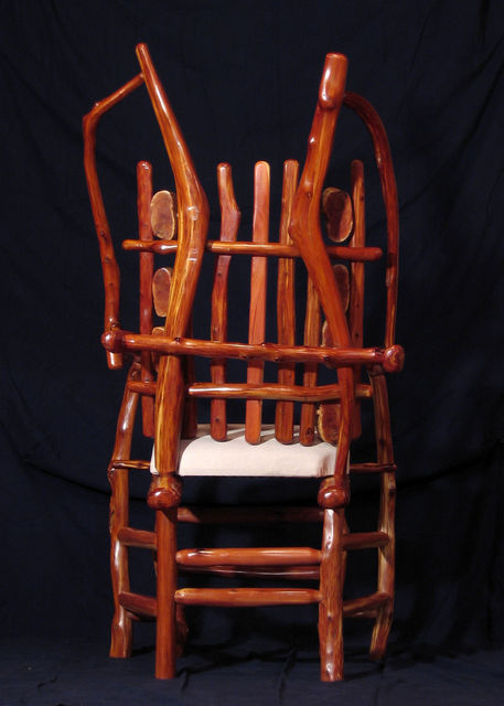 Chair with arms. Center back support of white colored red cedar matches white pigskin seat. Has 8 oblong shaped cross slices of cedar joined by mortise and tenon to cedar rungs forming back of chair. Double front legs on chair give appearance of "queenly" throne. Polished wood, wax only finish.